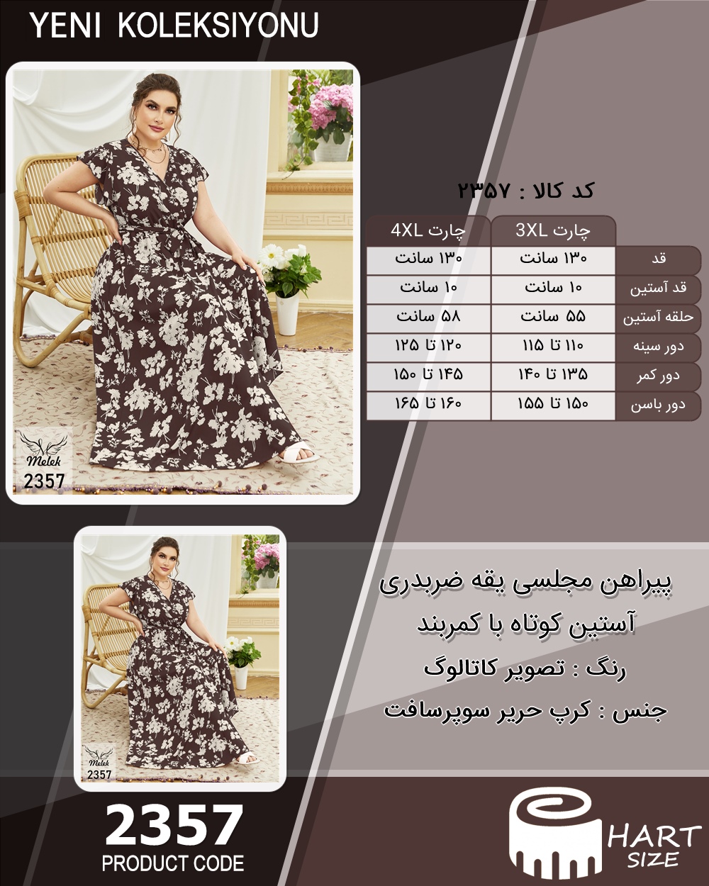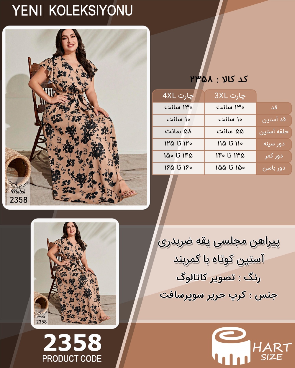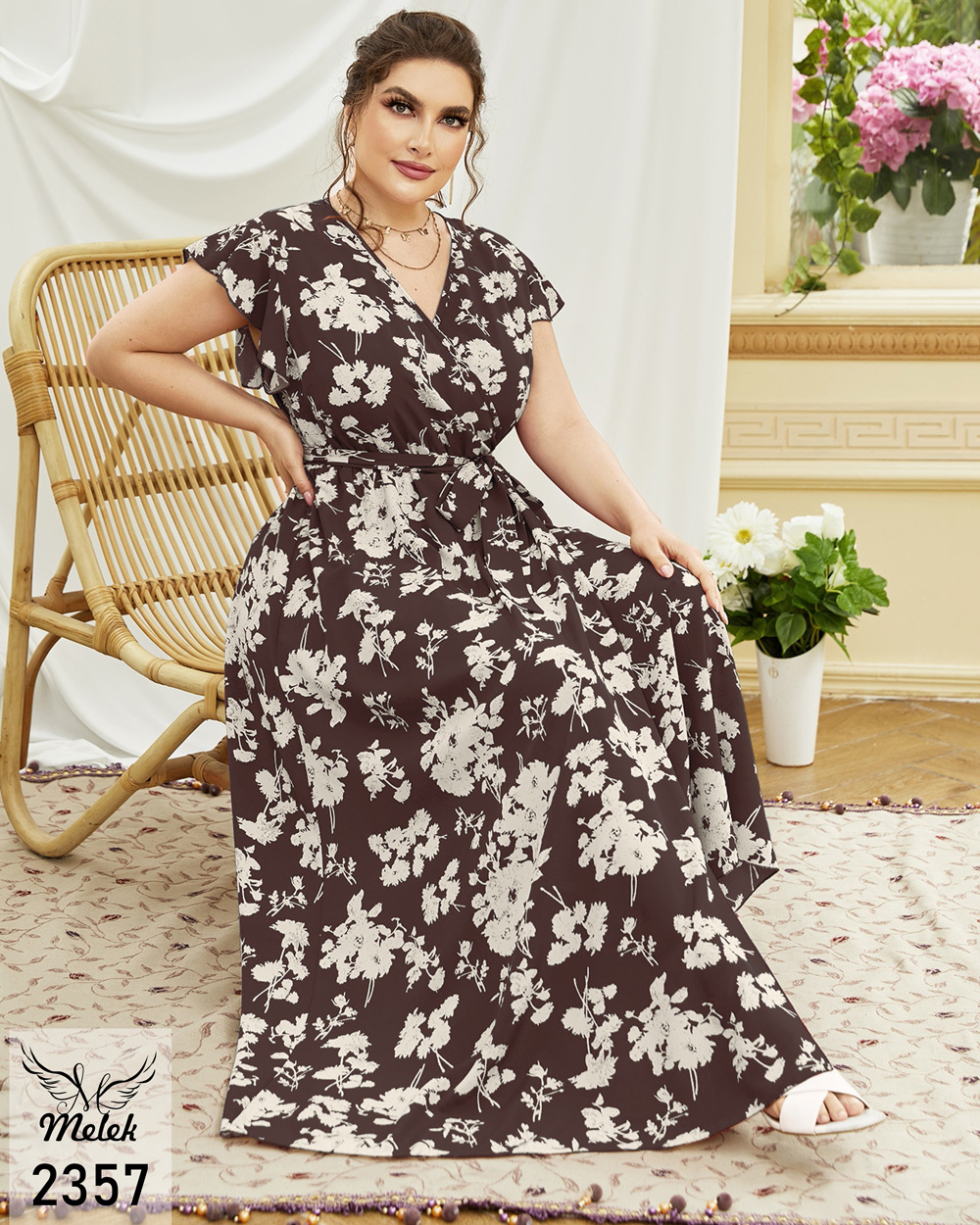 پیراهن مجلسی یقه ضربدری آستین کوتاه با کمربند سایز بزرگ